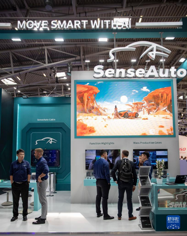 這是9月4日在德國慕尼黑國際車展媒體預(yù)展上拍攝的商湯科技展臺。
