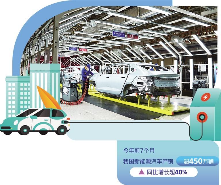 新能源汽車是全球汽車產(chǎn)業(yè)轉(zhuǎn)型升級、綠色發(fā)展的主要方向,也是我國汽車產(chǎn)業(yè)高質(zhì)量發(fā)展的戰(zhàn)略選擇。今年前7個月,我國新能源汽車產(chǎn)銷超過450萬輛,同比增長超過40%。其中,出口63.6萬輛,同比增長1.5倍,成為我國經(jīng)濟一個強勁增長點。