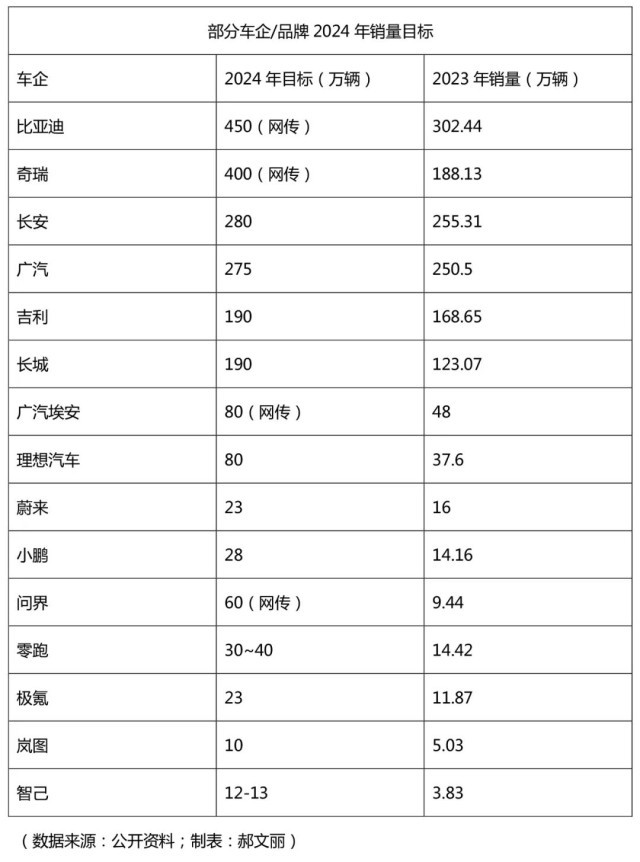 有的車(chē)企理性十足,將2024年目標(biāo)定在比2023年銷(xiāo)量略高;有的車(chē)企則相當(dāng)狂熱,目標(biāo)翻倍甚至翻幾倍!車(chē)企們2024年的目標(biāo)能實(shí)現(xiàn)嗎?超高目標(biāo)的車(chē)企哪來(lái)的自信?我們從中挑選了部分車(chē)企,對(duì)其公布的銷(xiāo)量目標(biāo)進(jìn)行盤(pán)點(diǎn)及分析,一探究竟。