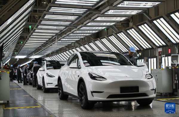 2023年12月22日,在特斯拉上海超級工廠內,工人在對出廠前的車輛進行漆面及門窗檢測。新華社記者方喆攝
