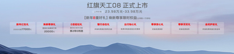 逐夢(mèng)新程,臻享超值。天工08共推出兩驅(qū)和四驅(qū)2種驅(qū)動(dòng)模式共5個(gè)版本供選擇,官方指導(dǎo)價(jià)為23.98萬(wàn)元-33.98萬(wàn)元。同時(shí),購(gòu)買(mǎi)天工08的消費(fèi)者還可尊享“新年8重好禮”限時(shí)權(quán)益,即刻購(gòu)車可享2000元抵17000元的新年紅包禮;置換補(bǔ)貼最高可享20000元的換新尊享禮;首付8.98萬(wàn)元起、享2年0利息的0息輕松禮;終身免費(fèi)高階智駕功能的智行自在禮;免費(fèi)充電樁或組合優(yōu)惠券的出行貼心禮;終身免費(fèi)保修的尊享安心禮;終身免費(fèi)保養(yǎng)的尊享無(wú)憂禮;終身免費(fèi)救援及取送車的全時(shí)護(hù)航禮。從購(gòu)車成本到金融方案,再到智駕裝備、質(zhì)量保障等方方面面,紅旗以超值權(quán)益帶來(lái)進(jìn)階的價(jià)值體驗(yàn),讓用戶買(mǎi)得舒心、用得安心。