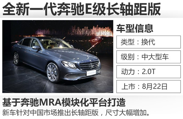 全新一代奔馳E級(jí)長軸距于上個(gè)月在北京奔馳亦莊工廠正式下線,新車針對(duì)中國市場的需求進(jìn)行了全面優(yōu)化,從外觀、內(nèi)飾到車身尺寸都有明顯提升。網(wǎng)通社從梅賽德斯-奔馳官方了解到,全新一代奔馳E級(jí)長軸距版將于8月22日在北京正式上市。新車采用不同調(diào)校的2.0T發(fā)動(dòng)機(jī),并首次搭載9速自動(dòng)變速箱。