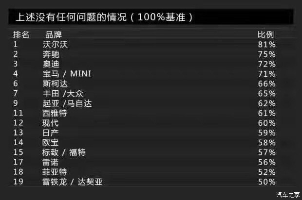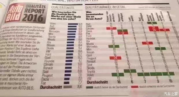 Bild調(diào)查的車身品質(zhì)(接縫)主要包括車身品質(zhì)、開關(guān)門的手感、鋼板接縫及經(jīng)常與身體接觸的地方。沒錯(cuò),這一單項(xiàng)表現(xiàn)最佳的是沃爾沃,得分為2分。這里小編要敲黑板提醒大家注意了:在車身品質(zhì)(接縫)滿意度上,得分最低表現(xiàn)最好。當(dāng)然,斯柯達(dá)也得到了2分,寶馬、奔馳則同為3分。而得分最高的就是前面提到的達(dá)契亞,它的得分是12分,換句話說就是達(dá)契亞是車身品質(zhì)滿意度最低的品牌。有意思的是與達(dá)契亞一起墊底是法系品牌雷諾,它的得分是11分。