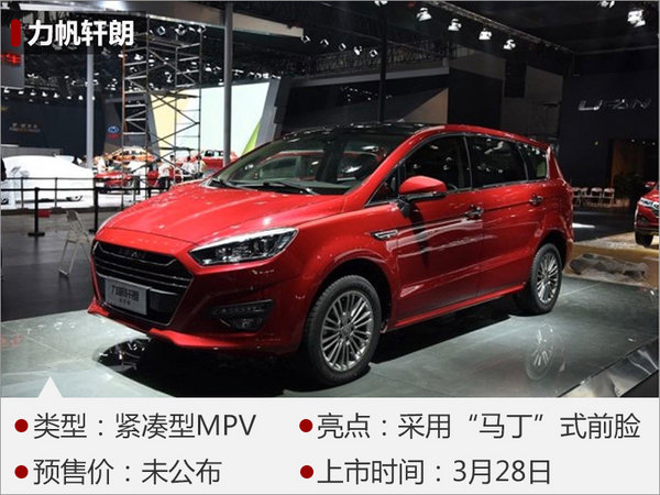 在2016年11月舉行的廣州國際車展上,力帆汽車對外發(fā)布了全新MPV—軒朗,其“馬丁”式前臉設(shè)計(jì)令人印象深刻,同時運(yùn)動化輪圈與下沉式車頂?shù)拇钆湟彩窍嗟靡嬲?。?nèi)飾方面,力帆軒朗以黑色為主,中控臺下方按鍵布局較為簡潔,實(shí)用性較高。力帆軒朗搭載了1.5L渦輪增壓和2.0L自然吸氣兩款發(fā)動機(jī),前者匹配的是8速自動變速箱或5速手動變速箱,后者則匹配的是5MT或CVT變速箱。新車將于3月28日正式上市。