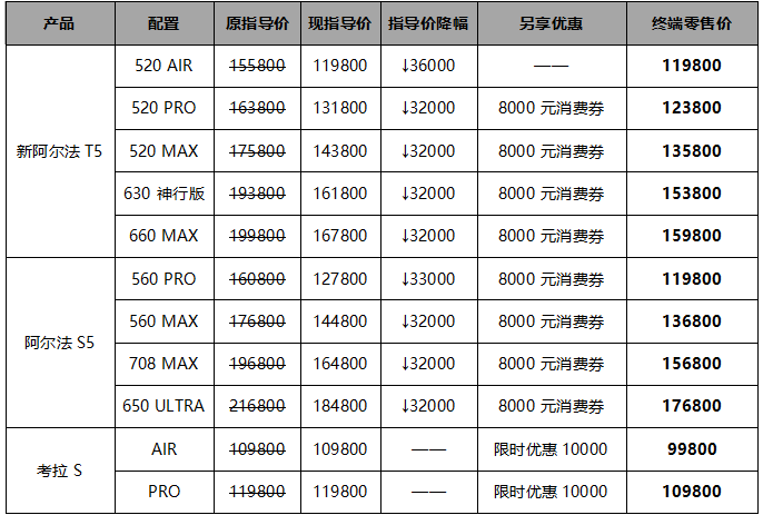 即日起,極狐對(duì)新阿爾法T5和阿爾法S5官方指導(dǎo)價(jià)進(jìn)行下調(diào),官方降價(jià)32000元,還可另享8000元消費(fèi)券,如此一來,5系“雙子星”終端零售價(jià)最低僅需11.98萬元;考拉S限時(shí)優(yōu)惠增至10000元,終端零售價(jià)直接下探到了9.98萬元起。
