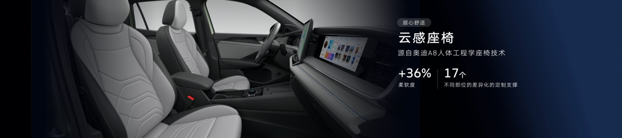 舒適體驗上,全新探岳L配備了專為中國用戶研發(fā)的云感座椅,座椅柔軟度提升了36%,坐上去可以完全放松。除柔軟外,云感座椅還擁有Audi A8同款人體工學座椅設計,提供身體從靠背到大腿共17處不同部位的差異化定制支撐,即使長途駕駛也不感疲憊,讓更多用戶體驗到越級的舒適。