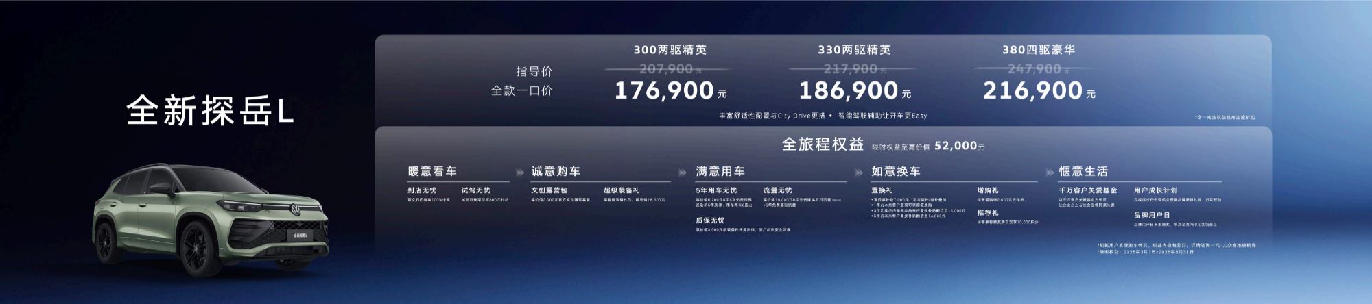 3月1日,一汽-大眾全新探岳L在五岳之首泰山震撼上市,新車共推出300TSI、330TSI、380TSI三種動力配置共3種車型,官方指導價20.79萬元起,可選裝舒適性配置豐富的City包和駕駛輔助功能Easy包?,F(xiàn)在購買全新探岳L,還將享受17.69萬元起的全款一口價。