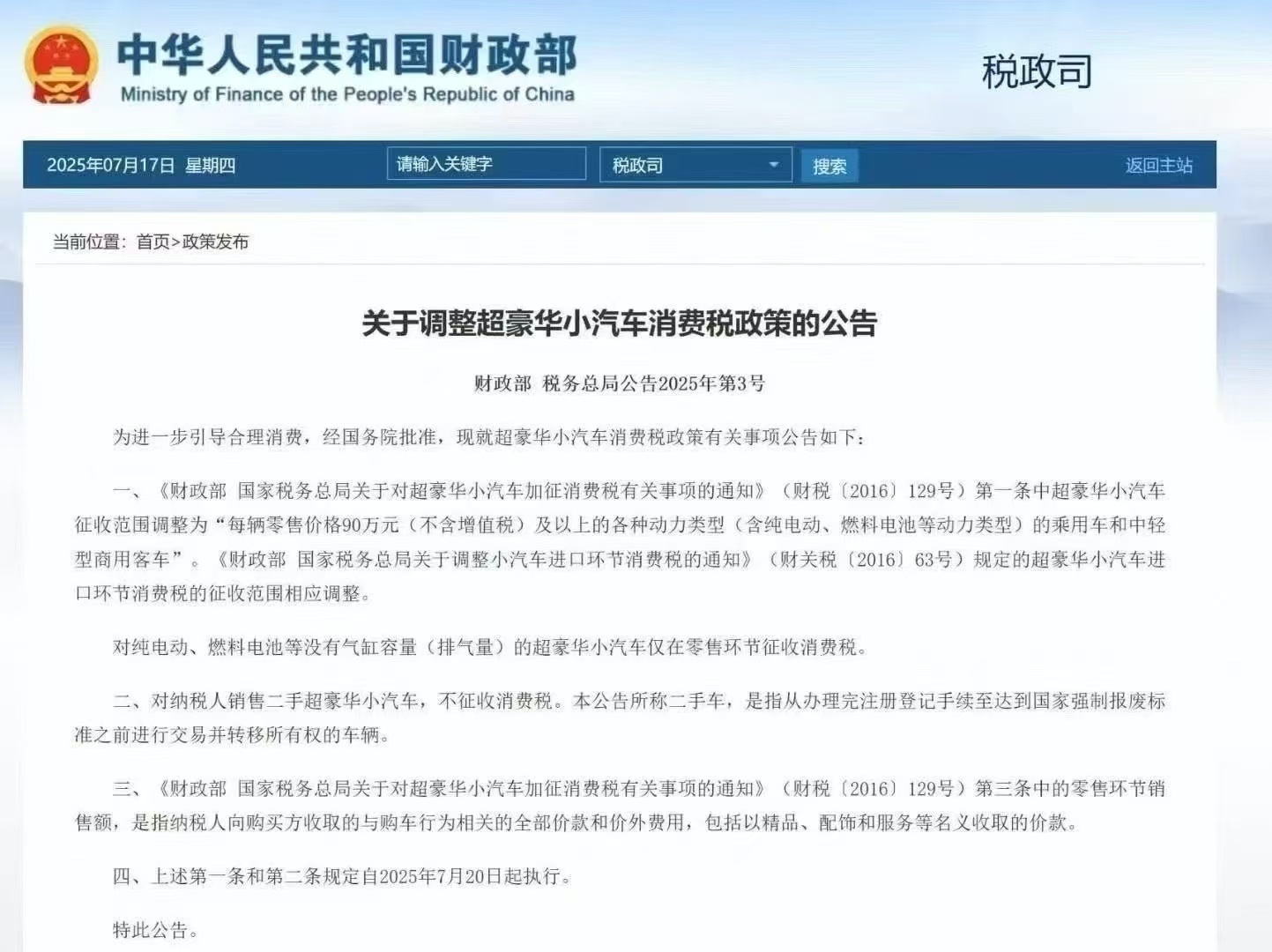 央廣網(wǎng)北京消息(記者董楠)7月17日,財(cái)政部、稅務(wù)總局聯(lián)合發(fā)布公告,對(duì)超豪華小汽車消費(fèi)稅政策作出調(diào)整。此次調(diào)整不僅將征稅門檻從130萬元(不含增值稅)降至90萬元,還在征稅環(huán)節(jié)、車型差異、二手車交易等方面做出明確規(guī)范,新政7月20日起正式執(zhí)行。這是2016年我國(guó)對(duì)超豪華小汽車加征消費(fèi)稅后的首次調(diào)整。