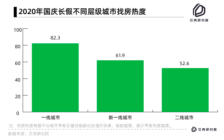 一個(gè)城市房產(chǎn)經(jīng)紀(jì)人帶客戶看房量——總帶看量,是衡量樓市熱度重要指標(biāo)。10月1日-7日,一線城市找房熱度高于新一線、二線城市。從城市之間熱度比較看,四個(gè)一線城市總帶看熱度指數(shù)為82.3,明顯高于新一線城市的61.9和二線城市52.6。