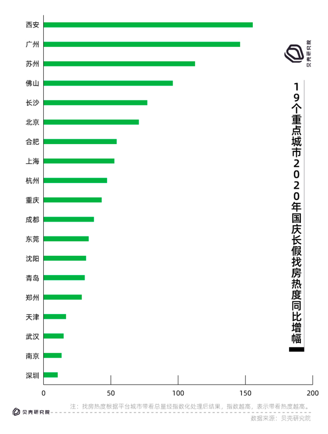 而深圳受調(diào)控政策影響,總帶看量同比僅增長(zhǎng)10.5%,帶看增幅排在19個(gè)重點(diǎn)城市最后。同樣,在南京、武漢和天津,十一假期帶看量增幅排名靠后,同比漲幅未超過(guò)20%。