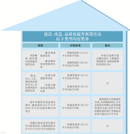 《辦法》提出,為環(huán)衛(wèi)工人、公共交通一線從業(yè)人員等城市重要公共服務(wù)群體提供租賃住房,且租金接受政府指導(dǎo)的,按以下標準給予補貼:新建租賃住房的,按建筑面積1200元/平方米給予補貼;改造租賃住房的,按建筑面積800元/平方米給予補貼;實施品質(zhì)化提升的租賃住房項目,按建筑面積600元/平方米給予補貼。