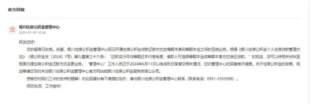 收到留言后,銀川住房公積金管理中心作出公開回復?;貜头Q:經查,銀川住房公積金管理中心現(xiàn)已開通住房公積金貸款還款方式在等額本息和等額本金之間的互轉業(yè)務。網(wǎng)友可以持相關材料至柜面辦理住房公積金還款方式變更業(yè)務。