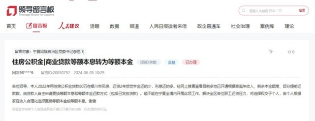 該網(wǎng)友上網(wǎng)查詢得知,目前多地已開通還款方式在等額本息與等額本金之間互轉的業(yè)務,借款人可自主申請更換等額本息和等額本金還款方式(包括已發(fā)放貸款),希望寧夏相關部門也可以開展此項工作,解決全區(qū)各位職工還貸壓力。