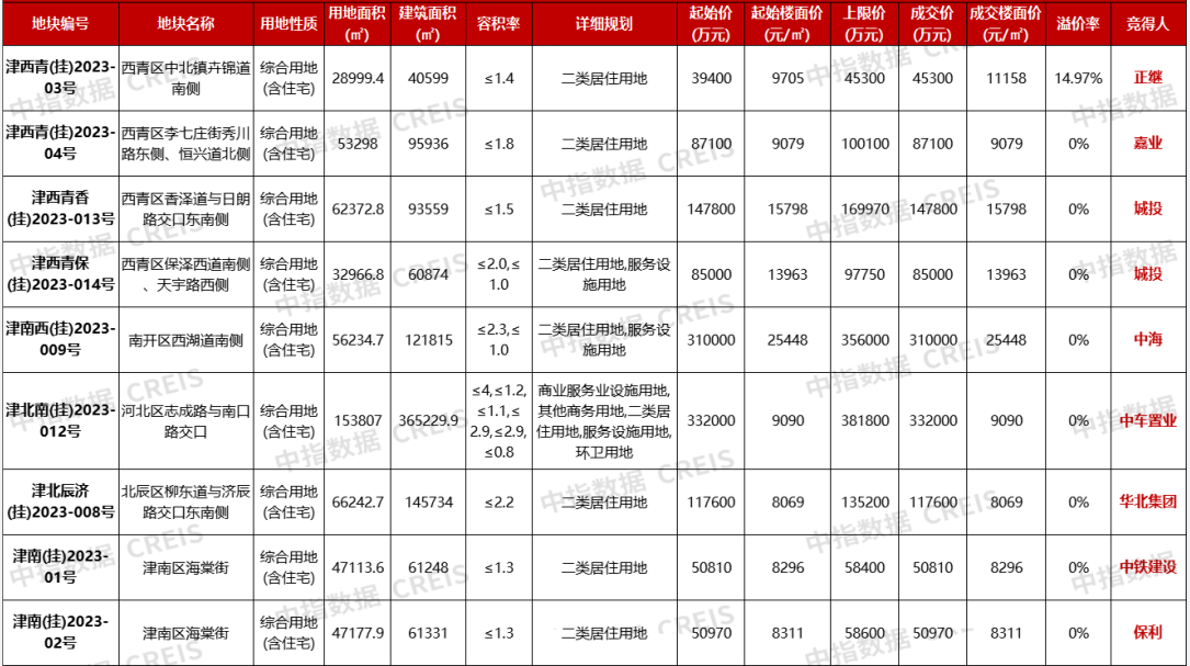 本次土拍觸頂搖號(hào)地塊為西青中北鎮(zhèn)的津西青(掛)2023-03號(hào)地塊,共有8家房企參與競拍。該地塊出讓面積約2.9萬平方米,起始價(jià)3.94億元。土拍現(xiàn)場,該地塊迅速“觸頂”進(jìn)入搖號(hào)環(huán)節(jié),有6家房企參與搖號(hào),最終由正繼以總價(jià)4.53億搖得,成交樓面價(jià)11158元/平方米,溢價(jià)率15%。