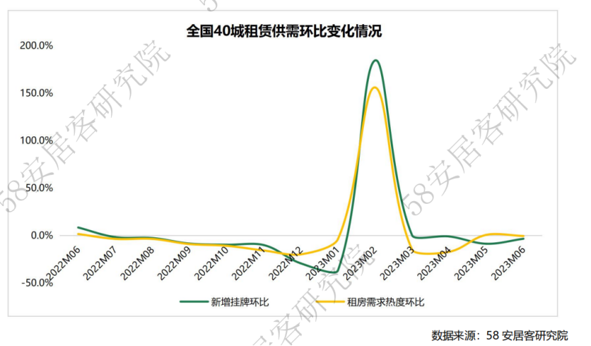 今年上半年,全國40城租賃市場供需基本處于同向波動,整體供需表現(xiàn)強于去年下半年。58同城、安居客《2023年上半年全國租賃市場報告》顯示,2月在春節(jié)后復產復工熱的帶動下,租賃市場迎來供需兩旺的“小陽春”行情。步入二季度后,隨著市場供需在一季度的集中性釋放,租賃供需趨于回落。5月和6月,租賃市場步入傳統(tǒng)的夏季畢業(yè)求職旺季。