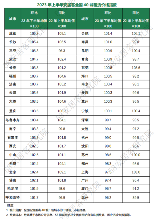 從城市價格表現(xiàn)來看,各城市間的分化差異顯著。58同城、安居客統(tǒng)計顯示,一線城市中,北京的租賃價格環(huán)比及同比均呈現(xiàn)上漲,上海、深圳和廣州較去年下半年租賃價格環(huán)比均呈現(xiàn)小幅下跌。多數(shù)二線城市租賃價格呈現(xiàn)顯著回升,如成都、長沙、武漢、福州、濟南、太原、烏魯木齊、合肥等城市價格表現(xiàn)相對較好。整體來看,2023年上半年市場普遍迎來復蘇之勢。