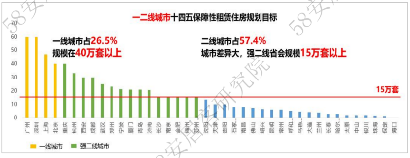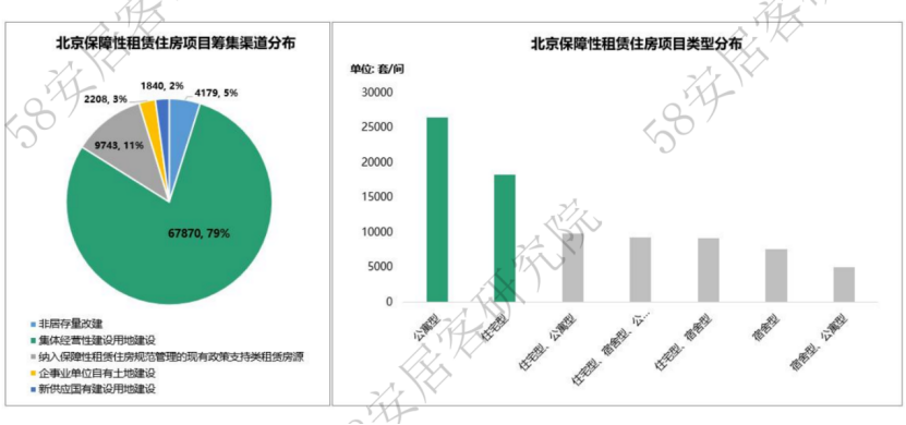 分城市來看,據58同城、安居客整理數(shù)據顯示,北京“十四五”期間,保障性住房供應占新增住房供應的比例達到52%。其中,保障性租賃住房規(guī)劃量最高,新增40萬套(間),占新增住房供應比例達到40%。根據北京已披露保障性租賃住房項目情況,主要以集體經營性建設用地新建為主,而公寓型產品最多。目前,已披露項目供應集中于需求旺盛區(qū)域,如朝陽、豐臺、大興和通州。同時,項目開發(fā)主體中,國企和集體所有制企業(yè)的項目占比約80%,參與民企主要為聚焦租賃業(yè)務的龍湖、城家。