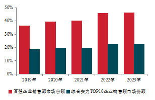 報告顯示,2023年,百強(qiáng)企業(yè)銷售總額、銷售面積分別達(dá)53896.0億元、26131.6萬平方米。 百強(qiáng)企業(yè)市場份額為46.2%,較上年微增0.4個百分點。