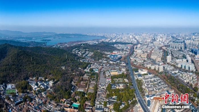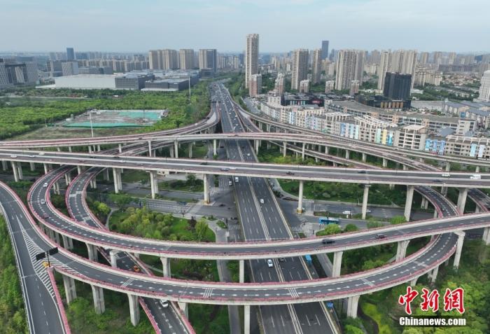 杭州一座高架互通上月季花盛放。(無(wú)人機(jī)照片)中新社記者 王剛 攝
