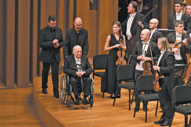 指揮大師祖賓·梅塔坐著輪椅被推上舞臺(tái)。劉方 攝
