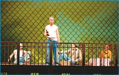 坐滿觀眾的劇場(chǎng),大幕拉開,燈光追隨,被判謀殺罪的銀行家安迪由獄警押解上場(chǎng)。身后的鐵牢籠里傳出起哄聲:“看吶,來新人了!”……
