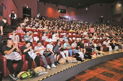 在志愿者引導(dǎo)下,導(dǎo)盲犬的主人在影廳第一排坐下,犬只安靜趴在腳邊。整個影廳360多個座位幾乎滿座。與日常觀影不同,這里的觀眾幾乎都是視障者,影廳一角還配備了專門的現(xiàn)場解說團隊。當燈光暗下,銀幕亮起,除了影片本身的臺詞和配樂,現(xiàn)場還響起了一道溫暖的人聲,描述著人物的表情、場景的變換、動作的細節(jié)……