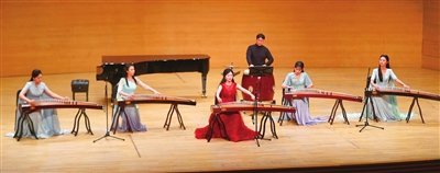 壓軸登場的古箏協(xié)奏曲《紫禁·瑤光》堪稱本場演出視聽亮點。吉煒領(lǐng)奏的團隊以傳統(tǒng)箏搭配七聲弦制古箏及復(fù)原古樂器筑、軋箏,在王梓碩的打擊樂配合下,既展現(xiàn)宮廷音樂的風(fēng)雅,又以“玉之光采”頌揚君子品格,古樸與創(chuàng)新的融合贏得全場持久掌聲。