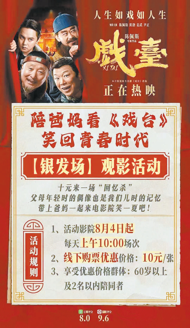《戲臺(tái)》則推出“銀發(fā)場”特惠活動(dòng)?!靶Ч貏e好,線上線下都傳開了,很多觀眾打電話來咨詢?!瘪T賀楠說,北京大約四分之一的影院都有“銀發(fā)場”,他所在影院的“銀發(fā)場”上座率在《戲臺(tái)》所有場次中是最高的。 (北京晚報(bào)記者 袁云兒)