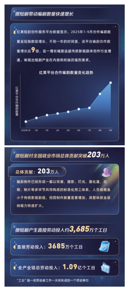這不僅大幅提升了人力資源的利用效率,也為從業(yè)人員帶來(lái)了長(zhǎng)期且穩(wěn)定的工作預(yù)期,吸引了大量人才涌入。以編劇為例,紅果短劇創(chuàng)作服務(wù)平臺(tái)數(shù)據(jù)顯示,2025年1-9月合作編劇數(shù)量呈現(xiàn)指數(shù)級(jí)增長(zhǎng),不到一年的時(shí)間里,平臺(tái)編劇合作數(shù)量增長(zhǎng)近9倍,遠(yuǎn)超傳統(tǒng)影視劇本創(chuàng)作行業(yè)增速。