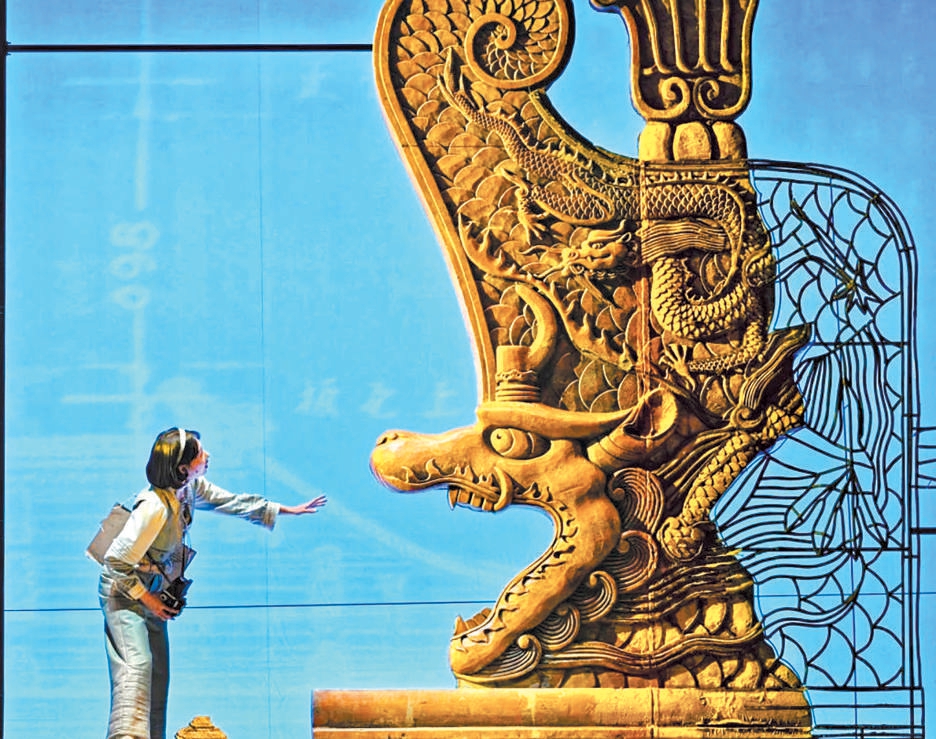 王琛透露,舞臺(tái)上關(guān)鍵的古建筑構(gòu)件均嚴(yán)格按照1∶1的真實(shí)比例復(fù)原制作,當(dāng)它們懸置于觀眾面前,一種視覺上的“沖擊力”油然而生,“觀眾能直觀體會(huì)到劇中人物每日工作的物理尺度和精神重量,體會(huì)測(cè)繪隊(duì)員是以怎樣的血肉之軀攀爬、丈量并挽留這份巍峨的文明?!蔽枧_(tái)地面,北平時(shí)期中軸線的建筑脈絡(luò)化為起伏線條,如紙張般弧形掀起,“寓意著古城文明在戰(zhàn)火中飄搖欲飛卻又根基深植的命運(yùn)。建筑的‘實(shí)’代表文明遺產(chǎn),圖紙的‘虛’代表傳承意志,虛實(shí)明暗的銜接過渡,共同凝固了那段驚心動(dòng)魄的歷史?!保ㄓ浾?高倩)