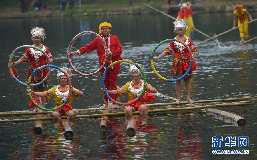 1月1日,“獨(dú)竹漂”愛好者在花溪河上表演水上高難度平衡動(dòng)作。 2016年元旦,在貴陽(yáng)市花溪公園平橋河段舉行的貴陽(yáng)市第31屆冬泳表演活動(dòng)中,數(shù)十名“獨(dú)竹漂”愛好者在花溪河上腳踏漂浮的竹竿,表演“金雞獨(dú)立”、轉(zhuǎn)身平衡等高難度動(dòng)作,讓觀眾大飽眼福。新華社發(fā)(秦剛 攝)