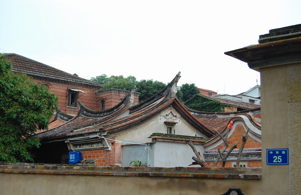 在大量的華僑洋樓建設(shè)中,體現(xiàn)出一些新風(fēng)尚:一方面,立面上采用紅磚墻與少量白色線條對比的手法蔚然成風(fēng),延續(xù)了閩南紅磚厝紅磚白石的裝飾傳統(tǒng);另一方面,以裝飾藝術(shù)風(fēng)格為代表的裝飾元素逐漸流行,并融合常見的傳統(tǒng)裝飾題材及西方古典裝飾元素。