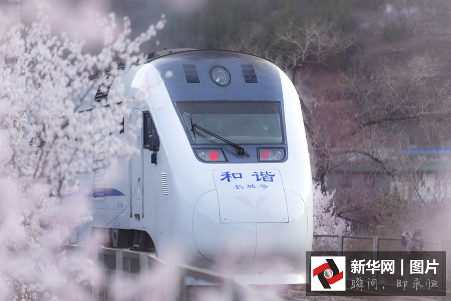 2016年3月23日,中國(guó)北京,又到一年花開(kāi)時(shí),數(shù)京城最美的鐵路景色還看京張鐵路居庸關(guān)。漫山遍野的桃花盛開(kāi),S2雪白的列車(chē)穿行其中,美不勝收。圖片來(lái)源:東方IC