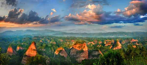 萬佛山地處云貴高原向南嶺山地的過渡地帶。經(jīng)數(shù)以億年的流水、風(fēng)化地質(zhì)作用,逐漸發(fā)育呈現(xiàn)出丹霞赤壁、石嶺、石寨、石柱、石橋、一線天、狹谷、溝巷等奇特的丹霞地貌自然景觀。域內(nèi)丹霞峰林拔地而起,巍巍陣列,尤如一幅天然水墨長卷。登臨萬佛山主峰山頂,俯視峰林,氣勢磅礴,向西南可望海神龜活神活現(xiàn);向北望毛蠟燭峰、天書巖、夫妻巖形象逼真;向南可遠眺將軍山主峰及該將軍山景區(qū)螺絲峰和神仙洞景區(qū)大寨巖主峰及神仙山主峰。群峰列陣,萬佛朝宗,不愧為“丹霞群峰第一山”。