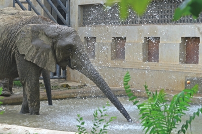 在大象展區(qū),寬敞的運(yùn)動(dòng)場地上,淋浴噴頭頗為顯眼,下方還有一個(gè)半米多深的水池,天氣熱的時(shí)候,大象可以邊淋浴邊戲水,時(shí)不時(shí)甩開長鼻子吸起水來為自己沖涼。運(yùn)動(dòng)場上還有兩個(gè)七八米高的草棚,沖完涼的大象可以躺在下面乘涼休息。