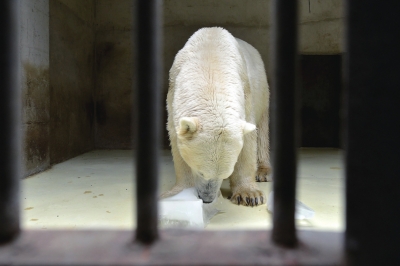 這時(shí),飼養(yǎng)員向北極熊的“客廳”投進(jìn)去兩大塊冷凍冰塊,不一會(huì)兒,一只胖胖的北極熊挪動(dòng)著龐大的身軀慢慢地從自己“臥室”走出來,雙手抱起冰塊,放在嘴邊啃起來。