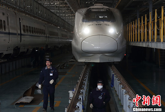 1月15日,南京動車運用所的工作人員對滬寧城際動車組列車進(jìn)行精檢細(xì)修,通過全面的“體檢”確保其安全運行。據(jù)悉,春運期間,上海鐵路局開行客車總數(shù)達(dá)1053對,其中安排動車組達(dá)到663對,占比63%,運力為歷年之最。