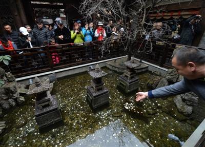 中午時分,記者又一次仔細觀察了水池,在游人拋投硬幣時,確實有一兩條金色的觀賞魚在石縫處游動著。在木制欄桿四周,正貼著“禁止倚靠欄桿”、“禁止投幣”等字樣。“春節(jié)游客爆滿,水池是從寬巷子到窄巷子的必經(jīng)之道,加上很多人在拋硬幣,頓時人滿為患。我們只好打印了幾張?zhí)嵝褟堎N起來?!鞭k公室工作人員還表示,“等春節(jié)游客潮稍微退卻,天氣回暖,我們就要派人下水打撈這些硬幣,用于景點建設(shè)?!?/p>