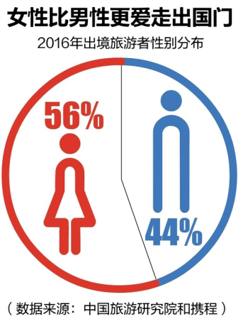 而在性別上,女性比男性更愛(ài)走出國(guó)門(mén)。中國(guó)旅游研究院和攜程的報(bào)告顯示,根據(jù)在線出境游的性別、年齡統(tǒng)計(jì),2016年出境旅游者中,56%是女性,44%是男性,女性比例高12個(gè)百分點(diǎn)。