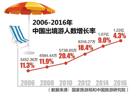 2017年春節(jié)假期,615萬(wàn)國(guó)人到世界各地歡度新春佳節(jié),創(chuàng)出了出境游歷史新高,引來(lái)世界矚目。實(shí)際上,早在2011年,中國(guó)已成為世界第一大客源國(guó),2014年出境游人次首次破億,2016年更是達(dá)到了1.22億人次。這一數(shù)字相當(dāng)于我國(guó)人口數(shù)量前七位的重慶、上海、北京、成都、天津、廣州、保定的總和,也接近目前日本的總?cè)丝跀?shù)。
