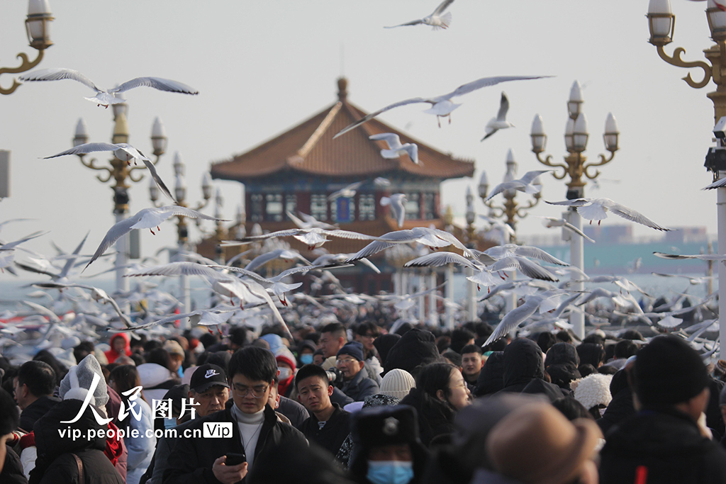 2026年1月30日,山東青島棧橋景區(qū),成群的海鷗在空中飛翔盤旋,吸引眾多游客前來觀賞互動(dòng),拍照留影。黃杰顯攝(人民圖片網(wǎng))