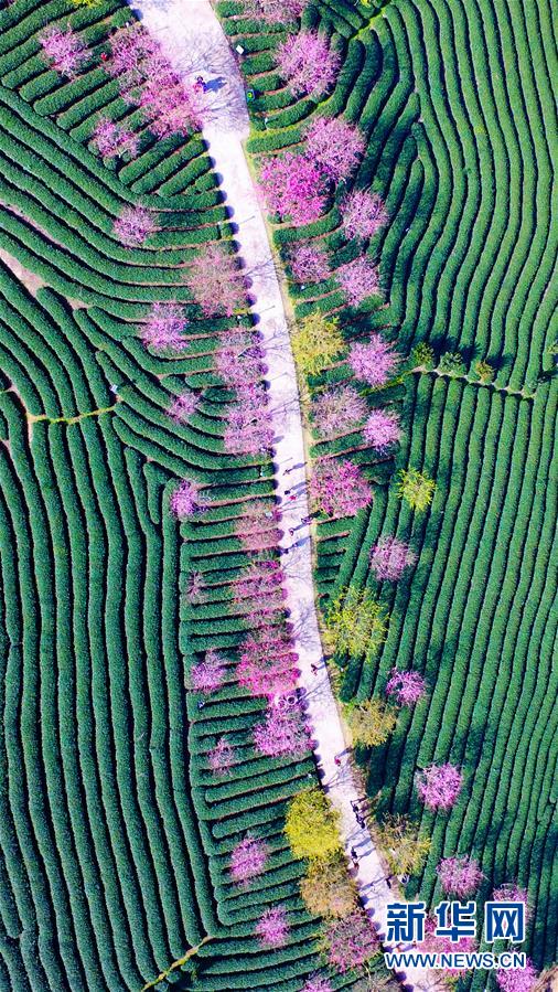 這是2月27日在福建省龍巖市永福鎮(zhèn)航拍的茶園和綻放的櫻花。 近日氣溫轉(zhuǎn)暖,位于福建省龍巖市永福鎮(zhèn)的15萬(wàn)株櫻花競(jìng)相綻放。新華社發(fā)(李藝爽 攝)