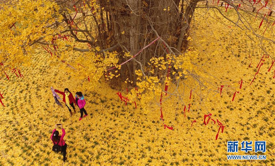 11月19日,游客在留壩縣玉皇廟鎮(zhèn)參觀千年銀杏樹。初冬時節(jié),在秦嶺深處的陜西省留壩縣玉皇廟鎮(zhèn)石窯壩村,一棵千年古銀杏樹的落葉宛如金色地毯,甚為壯觀。據(jù)當?shù)亓謽I(yè)部門介紹,該樹胸徑為4.45米,現(xiàn)有高度29米。新華社記者 陶明 攝