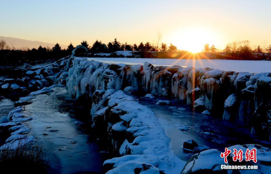 寒冬時節(jié),雪后初晴,地處甘肅河西走廊的張掖市濱河新區(qū)人工湖被白雪覆蓋,涓涓細流形成晶瑩剔透的冰瀑、冰掛,成為冬日一景。 陳禮 攝
