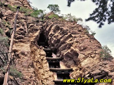 北洞是主體建筑部分。中區(qū)有大殿三間,座北向南。原為道教三清塑像,后被佛教改成三世佛。左右耳殿,另有東西配殿各三間,南閣一間。東側(cè)迎面山壁上,自然形成龐大的三角形石縫,內(nèi)有天然石洞,景觀奇特。石縫上端,外建五層樓閣。依崖開鑿卯洞,梁架結(jié)構(gòu)與崖石交接構(gòu)筑,建造精巧。閣內(nèi)設(shè)有鐵索,扶鐵索可攀援而上。在閣的東邊又有一洞,內(nèi)建殿三間,名九仙女閣,塑九仙女像。箭閣外塑趙杲泥像,頭頂距石崖僅二指半,故舊稱“趙杲觀,離天二指半”。再往南,就是趙杲觀最險峻的景觀了。峭峰高處,半山腰中,山洞前面,建樓三間。一眼望去,高閣懸空,上峭崖,下絕壁,左右山石如刀削。上下左右根本無路可通。山洞中垂下一條長約20米的鐵索,成了進洞的唯一途徑。只有勇敢的虔誠者或探險者,方可垂直攀索而登,一般人只能望樓興嘆,故鐵索被譽為“仙閣云梯”。三層樓建筑后依山洞,前為磚木結(jié)構(gòu)。上層內(nèi)塑太上老君、無始天尊、通天教主。中層內(nèi)塑關(guān)圣帝君。下層供修持者居住。當時修筑情景,真令人難以想像。北洞群落,地形險要,峰巒競秀,古木參天,峭峻幽邃,設(shè)計大膽,造型奇特。人夸“雁北懸空寺,不及代州趙杲現(xiàn)”說的并不過分。