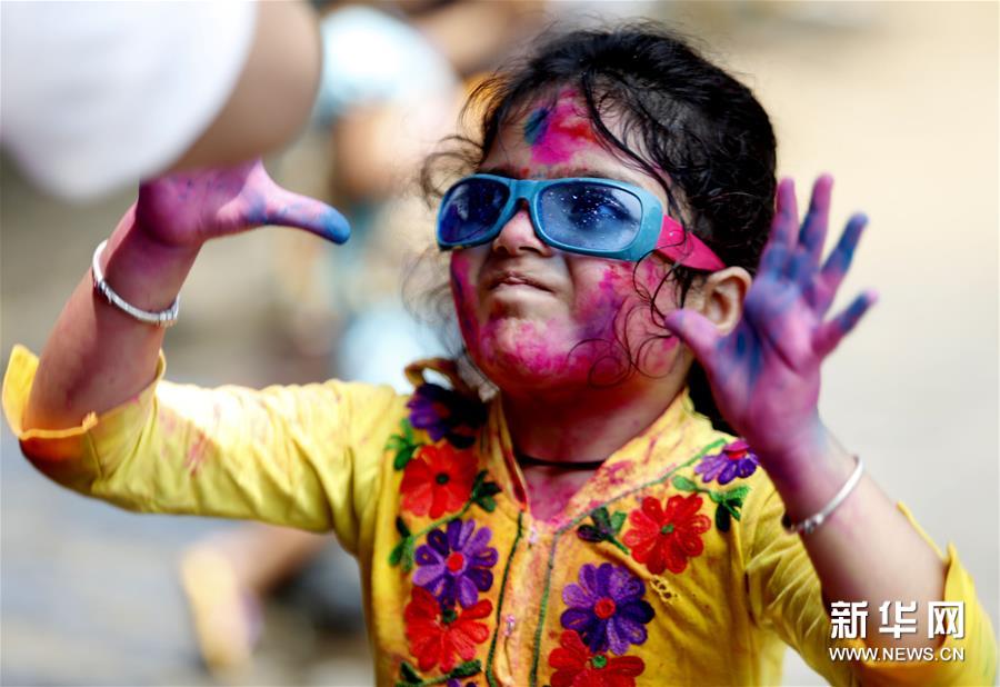 胡里節(jié)也叫“灑紅節(jié)”,人們?cè)谧约耗樕虾蜕砩贤可项伭希€向別人拋撒五顏六色的顏料和粉末,迎接春天的到來。新華社發(fā)(吳昂 攝)