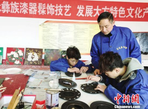 “大方彝族漆器髹飾技藝”貴州省級非遺代表性傳承人高光友指導(dǎo)學(xué)徒制作漆器。 從生漆收割、胎坯制作到漆器形成,全部50多道工序、80多個生產(chǎn)環(huán)節(jié),都需手工完成。其中,純大漆和皮胎等工藝是大方漆器所獨(dú)有。