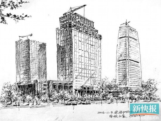 “以前工作日需要上班,我就利用周末在街巷間走動(dòng),看到地標(biāo)建筑就開(kāi)始畫(huà)。遇到正在施工的高樓,我就計(jì)算著日子,到高樓即將封頂?shù)臅r(shí)候,我就帶上紙筆到施工現(xiàn)場(chǎng)畫(huà)畫(huà)?!眳橇⒅薪榻B。