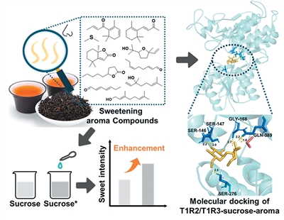 隨后,科研人員用“計(jì)算機(jī)模擬對(duì)接”技術(shù),發(fā)現(xiàn)這些香氣具有能幫助蔗糖更緊密結(jié)合甜味受體(T1R2/T1R3)的潛力。許勇泉打了個(gè)比方:“香氣分子好比潤(rùn)滑油,蔗糖好比鑰匙,前者能幫助后者它更快開(kāi)‘鎖’(甜味受體)。”