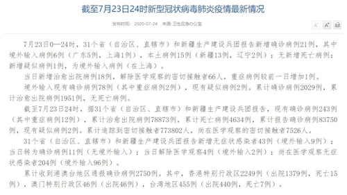 情況表示,截至7月23日24時,據(jù)31個?。ㄗ灾螀^(qū)、直轄市)和新疆生產(chǎn)建設(shè)兵團(tuán)報告,現(xiàn)有確診病例243例(其中重癥病例12例),累計(jì)治愈出院病例78873例,累計(jì)死亡病例4634例,累計(jì)報告確診病例83750例,現(xiàn)有疑似病例2例。累計(jì)追蹤到密切接觸者773802人,尚在醫(yī)學(xué)觀察的密切接觸者7526人。